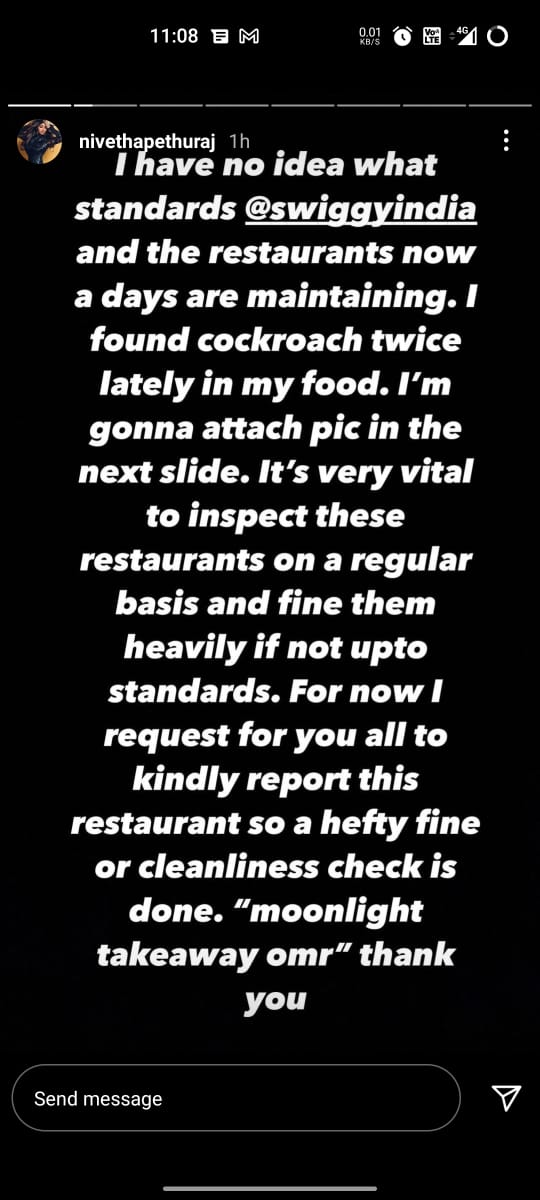இது தொடர்பாக நிவேதா பெத்துராஜ், ஸ்விக்கி நிறுவனம் மற்றும் உணவங்கள் என்ன தரத்தை தற்போது பின்பற்றுகின்றன என தெரியவில்லை. இதுவரை இரண்டு முறை எனது உணவில் கரப்பான் பூச்சியை கண்டெடுத்துள்ளேன். இத்தகைய உணவகங்களில் தினமும் சோதனை நடத்தி , தரமாக இல்லையென்றால் அதிக அபராதம் விதிக்க வேண்டும். இந்தியா முழுவது ஸ்விக்கி நிறுவனம் உணவு டெலிவரி செய்துவரும் நிலையில், தங்களது செயலியில் தரமான உணவகங்களை இணைக்க வேண்டும்” என்று அவர் கூறியுள்ளார்.
