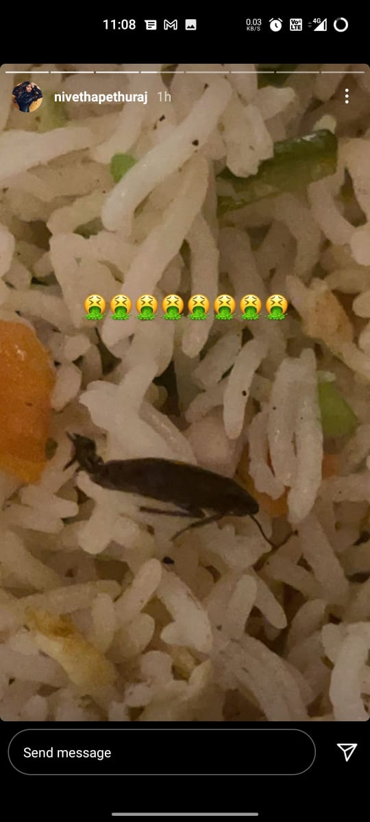 இன்ஸ்டாகிராம் சமூக ஊடக பக்கத்திலும் நிவேதா பெத்துராஜ் ஆக்டிவாக இயங்கி வருகிறார். இந்நிலையில், தனது ஸ்டேடஸில் அவர் வெளியிட்டுள்ள தகவல்கள் பரபரப்பை ஏற்படுத்துள்ளது. அதில், ஸ்விக்கி செயலி மூலம் பிரபல உணவகம் ஒன்றில் சாப்பாட்டை ஆர்டர் செய்ததாகவும், சாப்பாட்டை சாப்பிட முயன்றபோது அதில் கரப்பான்பூச்சி இருந்ததாகவும் அவர் தெரிவித்துள்ளார். இதற்கு ஆதாரமாக புகைப்படத்தையும் நிவேதா பெத்துராஜ் இணைத்துள்ளார்.