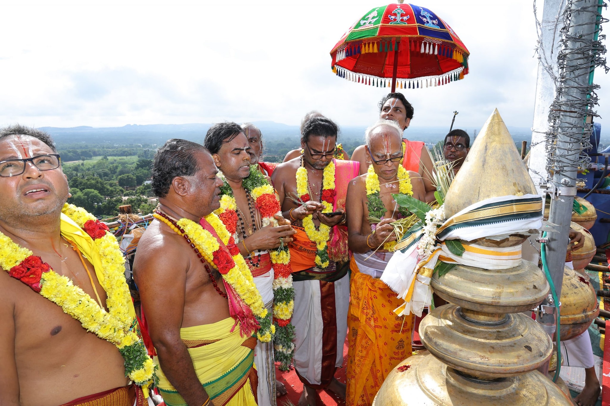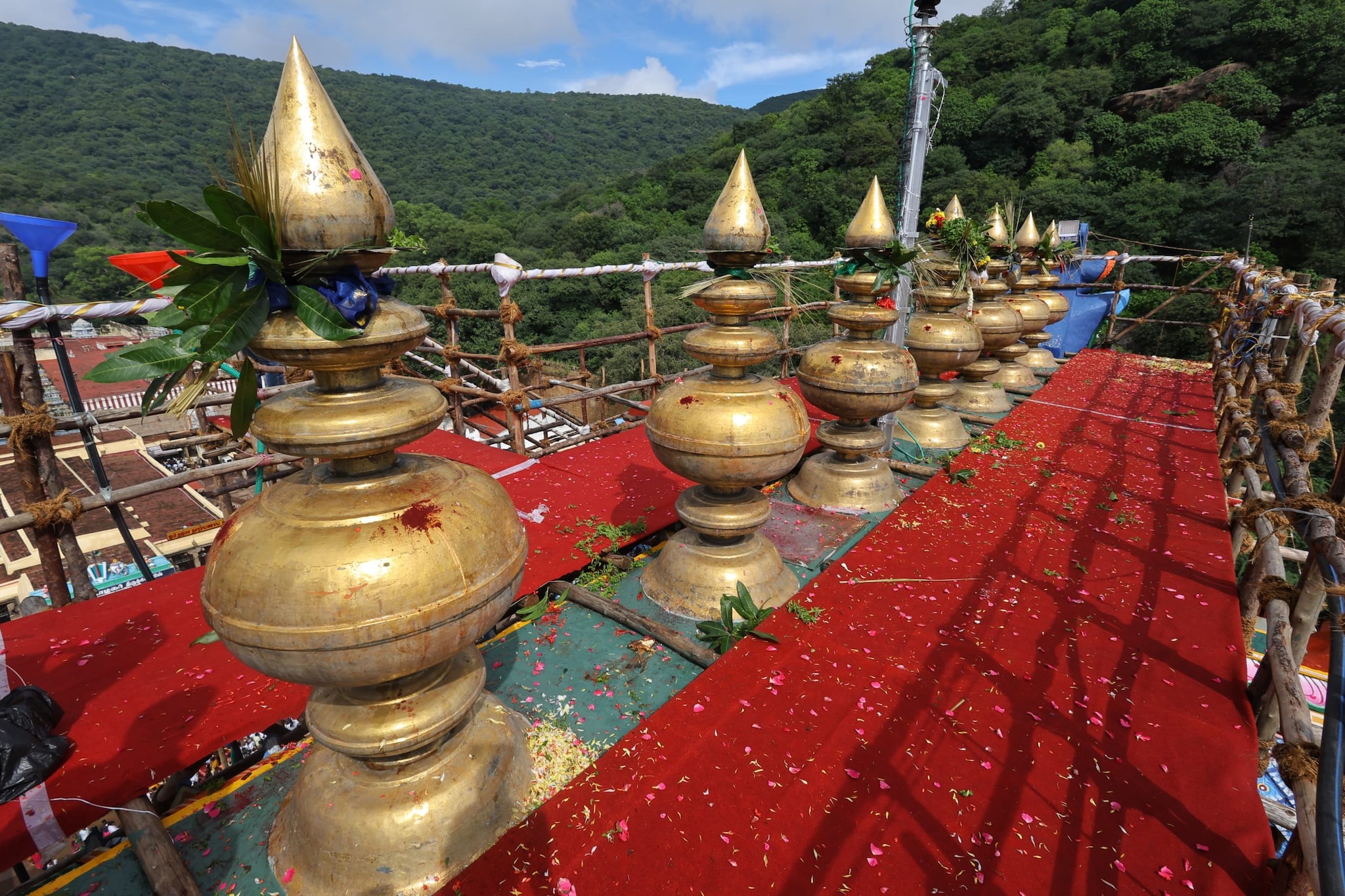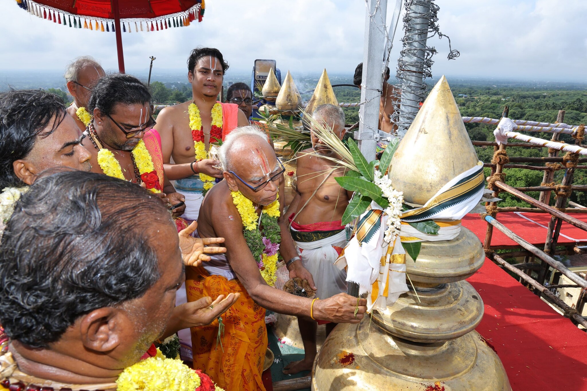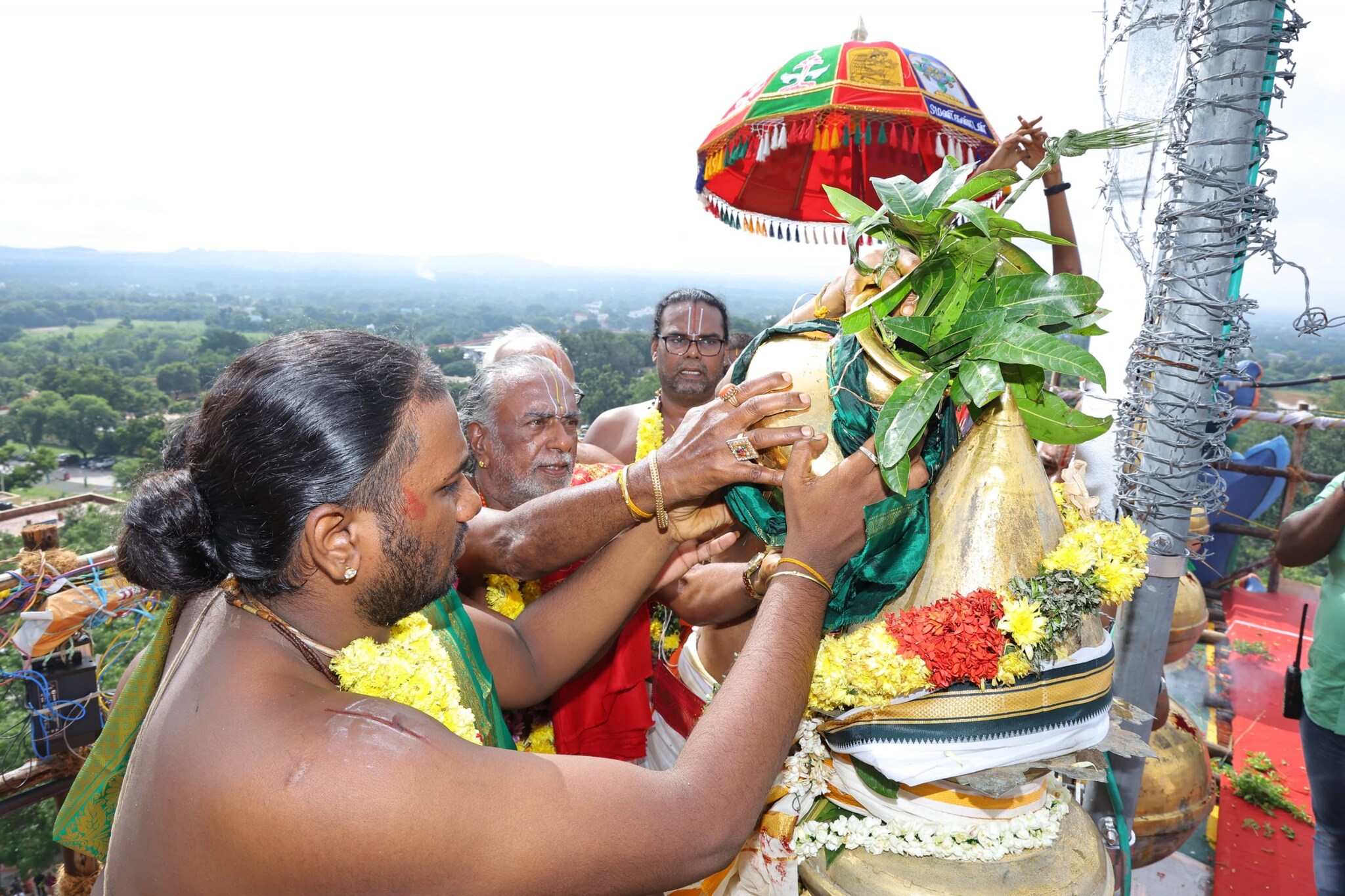 இன்று காலை 9 மணியளவில் மங்கல வாத்தியங்கள் முழங்க யாகசாலையில் இருந்து எடுத்து செல்லப்பட்ட புனித தீர்த்தம் கோவிலை வலம்வந்து கோபுர உச்சிக்கு எடுத்து செல்லப்பட்டது.